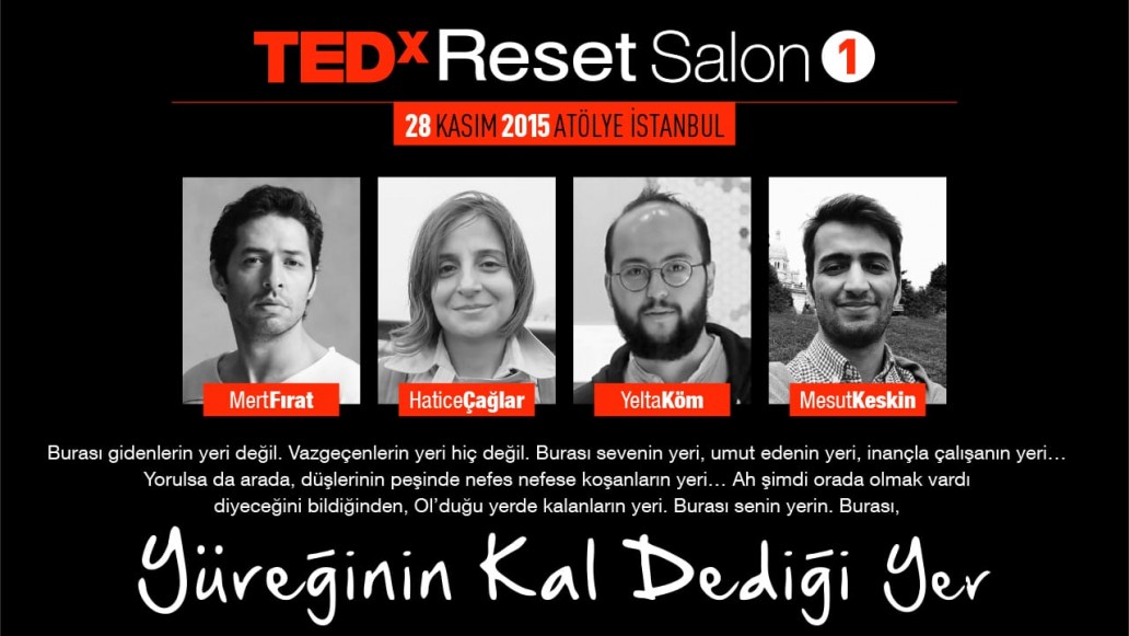 TED’in bize verdiği yeni yetki ile, yepyeni konseptimiz TEDxResetSalon’un ilk buluşması ‘Yüreğinin Kal Dediği Yer…’ 28 Kasım Cumartesi günü gerçekleşti. Etkinlik yeri, son zamanların en merak uyandıran mekanlarından biri, Bomonti Bira Fabrikası’nda yer alan ATÖLYE İstanbul’du. Üstelik buluşmadaki atıştırmalıklar, Anadolu mutfağını yeniden kimliklendirme hareketi olan Gastronomika tarafından hazırlandı.